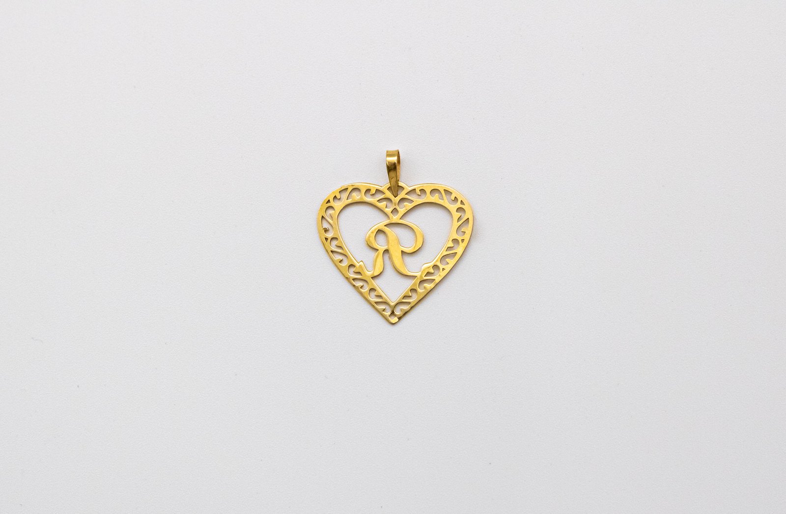 Pingente em ouro 18K formato coração vazado com letra “R” no centro